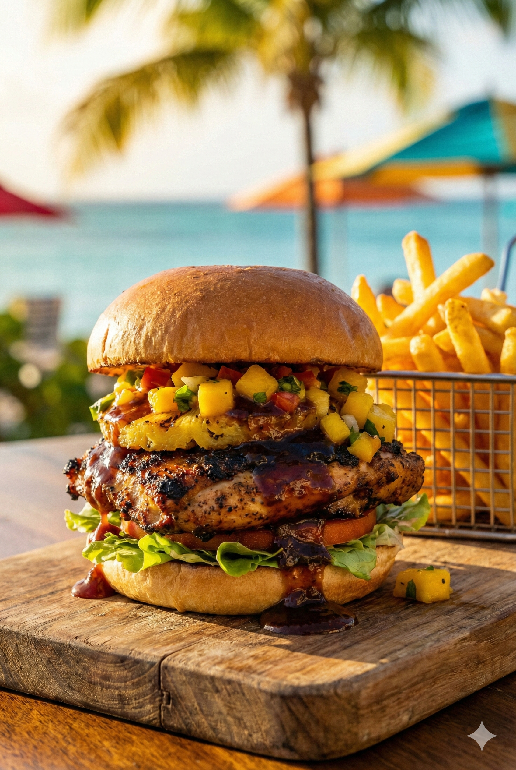 Then comes the “mix-up”. We top that savoury heat with a refreshing explosion of zesty pineapple and mango salsa for sweet relief, crisp lettuce, and ripe tomatoes. Finally, the whole creation is generously drenched in our signature glossy, dark jerk BBQ sauce that drips down your chin with every bite.